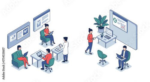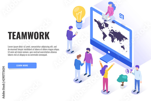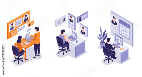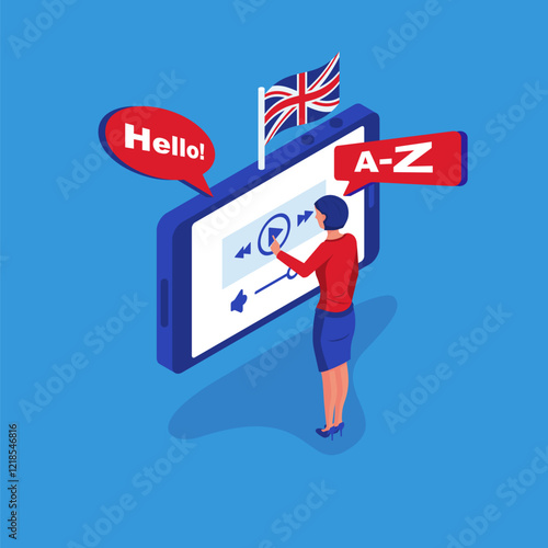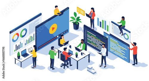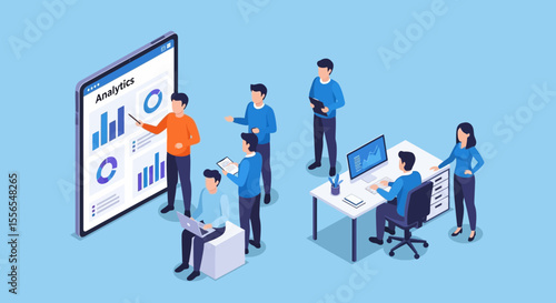 Огромный красный предупреждающий знак отмены и векторная группа людей, держащих баннер или плакат. Человеческая толпа на публичном протесте, мероприятие по проявлению социальной забастовки изометрическая иллюстрация