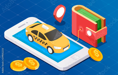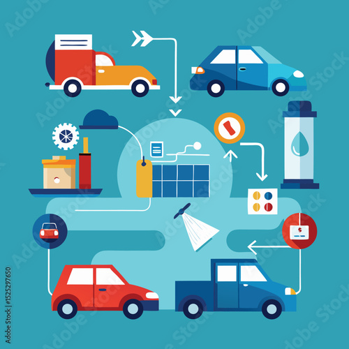 Роботы по сборке автомобилей, плоская векторная изометрическая иллюстрация. Автоматическая линия автозавода, милые роботы. Автоматизация производства и робототехнические технологии.