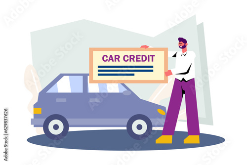 Векторный изометрический автомобиль, кредитный договор и покупатель, держащий ручку, чтобы подписать его. Концепция заявки на автокредит для веб-баннера, страницы веб-сайта и т.д.