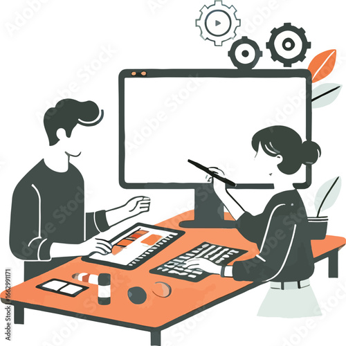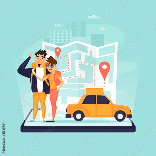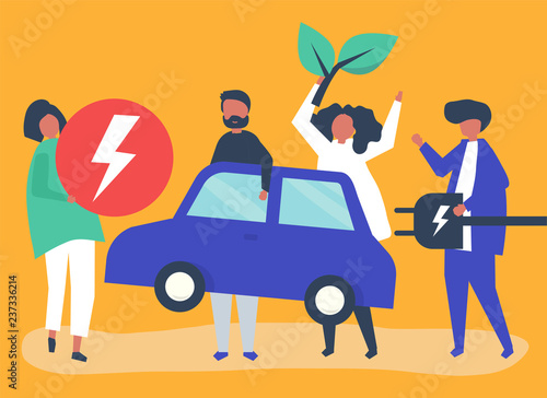 Заправка автомобиля на заправочной станции, плоская векторная иллюстрация. Водитель с копилкой, деньгами, кредитной картой. Заправщик бензиновой заправочной станции со шлангом бензонасоса.