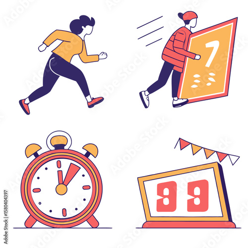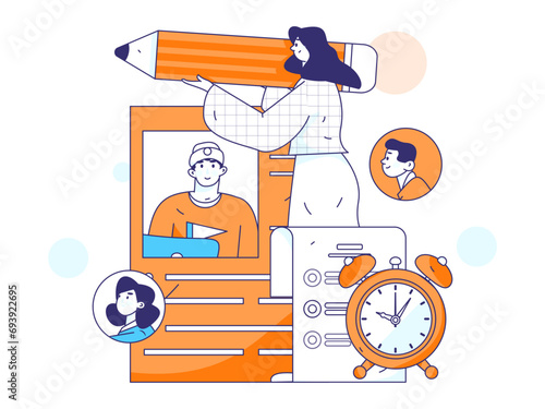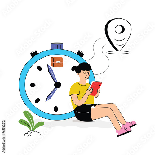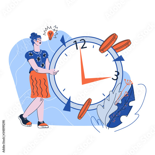 Автомобиль, стоящий на огромной часовой стрелке, большой паспорт и микро-мужские и женские персонажи с ключом, долларовая монета, векторная иллюстрация. Аренда автомобиля с концепцией наличных денег для веб-баннера, страницы веб-сайта и т.д.
