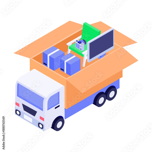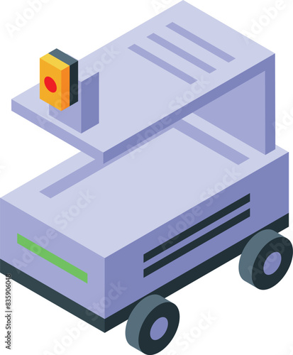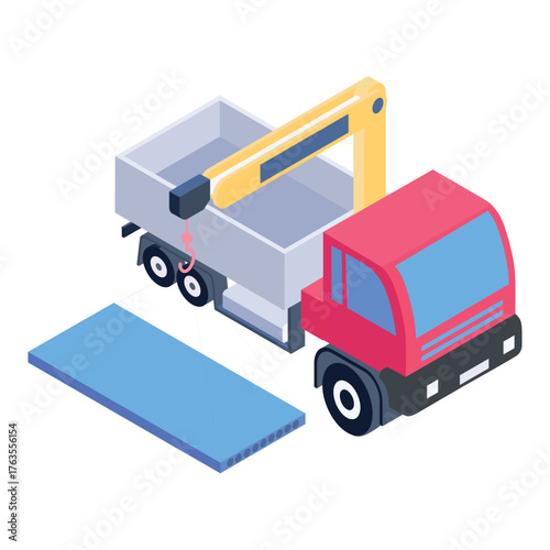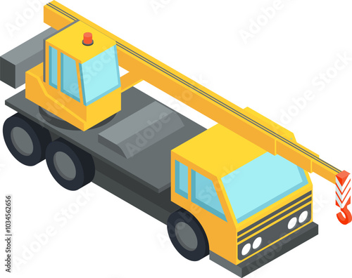 Векторная иконка службы экстренной помощи при дорожно-транспортных происшествиях и помощи грузовикам. Изометрический эвакуатор-эвакуатор поднимает разбитый автомобиль с иллюстрацией крана, выделенной на белом фоне