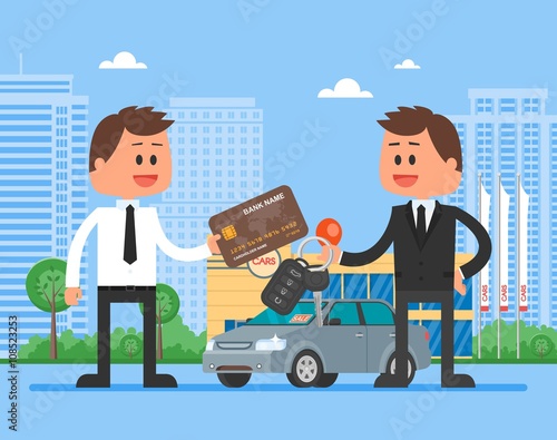 Продажа автомобилей векторная иллюстрация. Клиент покупает автомобиль у дилера concept. Продавец, дающий ключ новому владельцу.