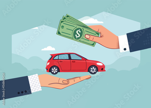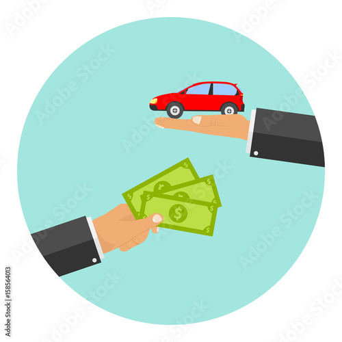 Продажа автомобилей векторная иллюстрация. Клиент покупает автомобиль у дилера concept. Продавец автомобилей дает ключ новому владельцу. Рука, держащая ключ от машины и деньги.