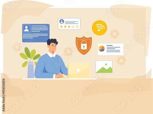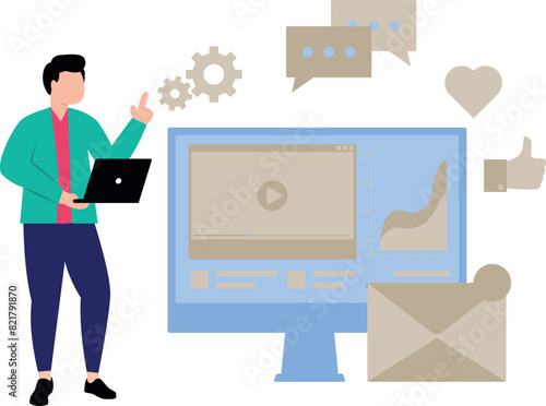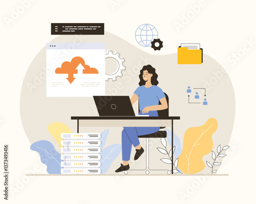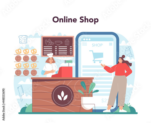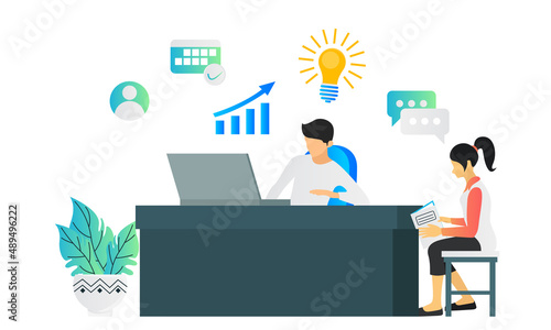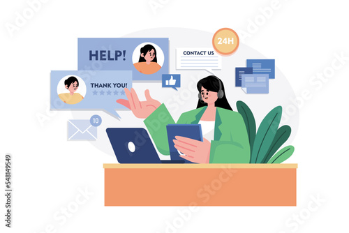 Векторная иллюстрация молодой женщины-администратора, стоящей за стойкой регистрации. Элемент дизайна приемной автомобильного магазина в плоском стиле.