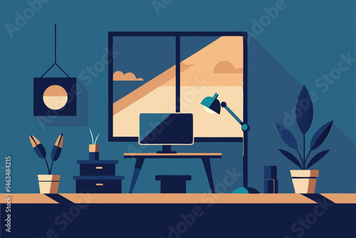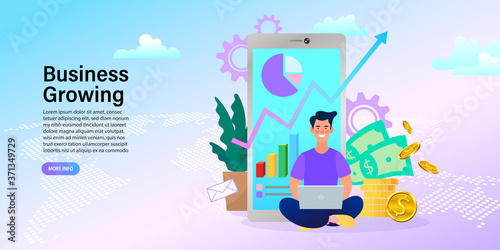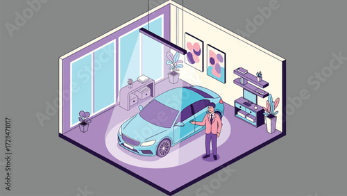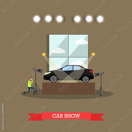 Векторная иллюстрация фотографа, фотографирующего новый автомобиль в выставочном павильоне, выставочном зале, автосалоне. Элемент дизайна в плоском стиле автосалона.