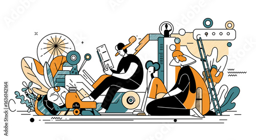 Огромные столярные ручные инструменты в наборе инструментов и микро-мужские персонажи столяр-ремонтник-плотник. Концепция строительства, ремонта дома и ремонта дома для веб-баннера, страницы веб-сайта и т.д.