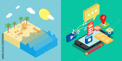 Концепция обслуживания автобазы в изометрическом стиле дизайна. Векторные плоские 3d иконки. Люди делят машины. Мобильный смартфон, чтобы поделиться поездкой и использовать парковку HOV lane. Совместная экономика и совместное потребление.