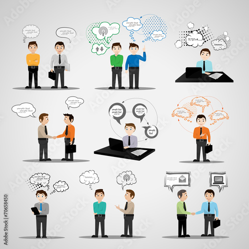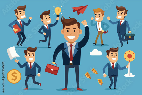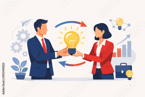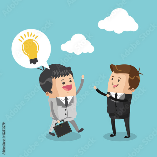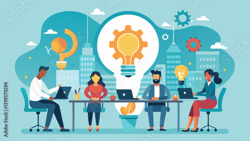 Мультяшный бизнесмен с идеей, выделяющейся из толпы. Векторная иллюстрация концепции в плоском дизайне. Творческие идеи, шестеренки, человеческие персонажи, лампочка, облака.