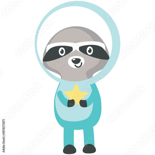 Мультяшный забавный енот в векторе скафандра космонавта. Забавный значок космического персонажа из мультфильма. Комическое животное-космонавт в шлеме астронавта, держащее звезду, выделенную на белом фоне