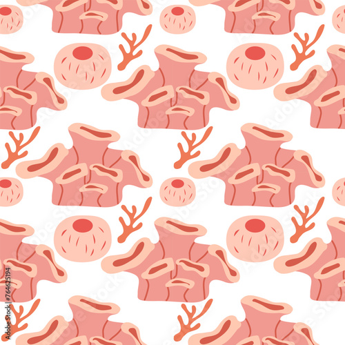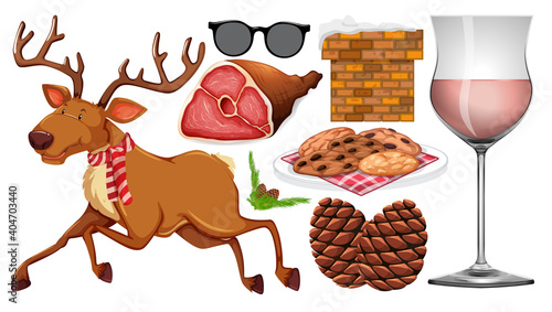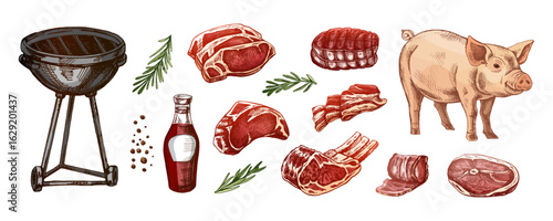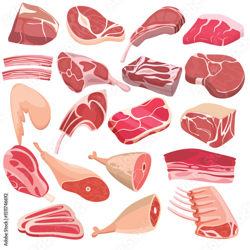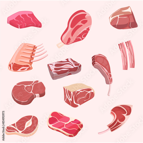 Мультяшный набор векторов свежего сырого говяжьего мяса. Разнообразные сырые коровьи органические продукты для иллюстрации барбекю. Целые и кусочками, стейк и филе, ребрышки и сосиски, выделенные на белом фоне