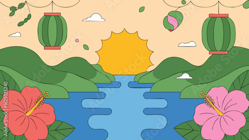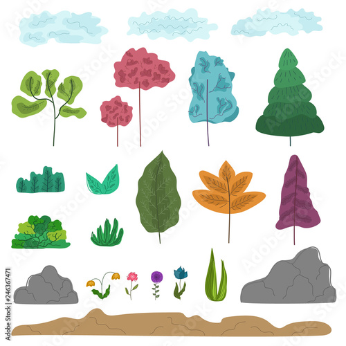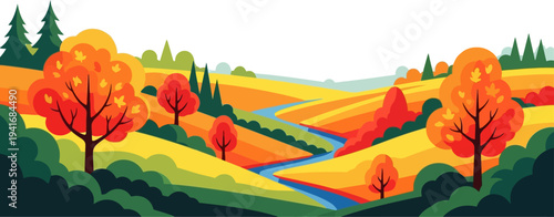 Мультяшное садовое поле на плоском векторном фоне природы. Луг с зеленой травой и желтыми деревьями осенняя сцена. Живописная панорама долины. Концепция садоводства и экологии