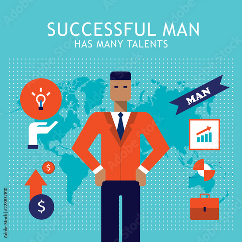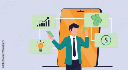 Мультяшная векторная иллюстрация для концепции финансового менеджмента и налогов. Счастливый бизнесмен заплатил все налоги. Значки автомобилей, домов, налогов, сбережений и кредитных карт. Плоский дизайн.