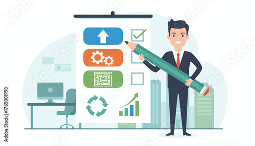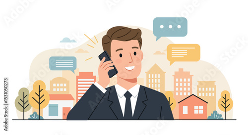 Мультяшная векторная иллюстрация для концепции финансового менеджмента и налогов. Счастливый бизнесмен заплатил все налоги. Значки автомобилей, домов, налогов, сбережений и кредитных карт. Плоский дизайн.
