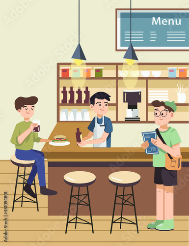 Кошка в кафе быстрого питания и продавщица за стойкой регистрации векторный значок, изолированный на белом фоне.