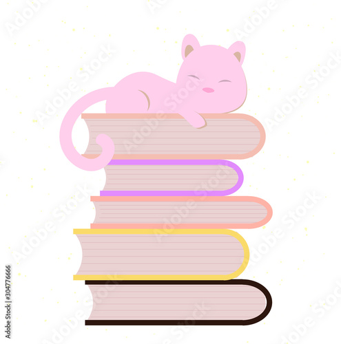 Векторная иллюстрация кошки. Милый мультяшный персонаж котенок, спящий на значке стопки книг. Сонный забавный дремлющий питомец, изолированный на белом фоне