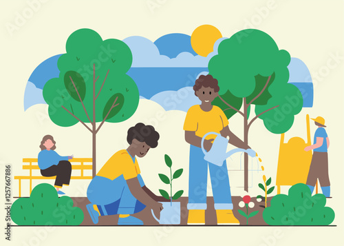Семья каменного века собирает хворост в лесу, чтобы развести костер. Векторная иллюстрация дизайна в плоском стиле отца с деревянной дубинкой, матери и дочери с сухими ветками.