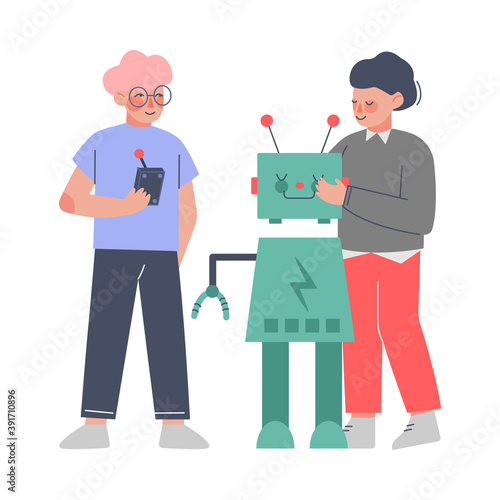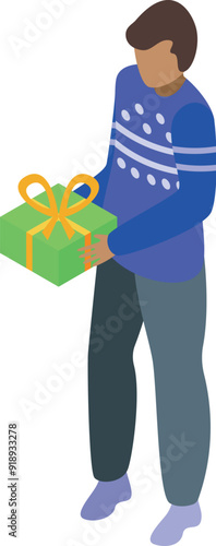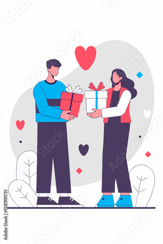 Молодой человек дарит подарочную коробку счастливой и удивленной женщине, векторная плоская иллюстрация, изолированная на белом фоне. Счастливая вечеринка по случаю дня рождения или другого торжества.