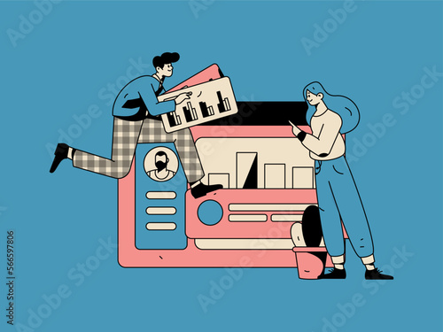 Векторная иллюстрация молодой пары, поднимающейся на подъемнике. Горные лыжи, горнолыжный курорт. Элемент концептуального дизайна кресельного подъемника в плоском стиле.