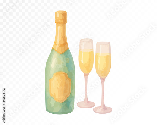 Пустая и полная бутылка шампанского с набором макетов бокалов для вина. Векторная реалистичная иллюстрация, изолированная на прозрачном фоне.