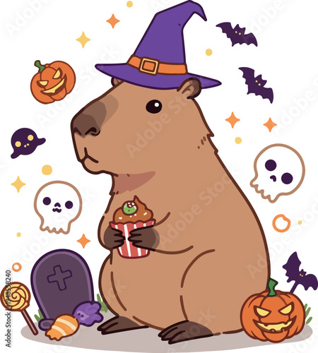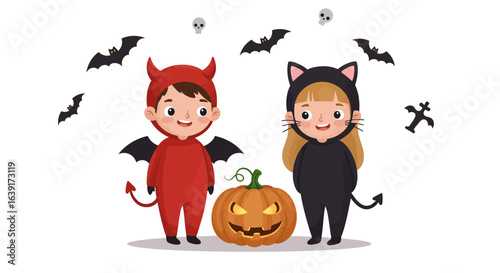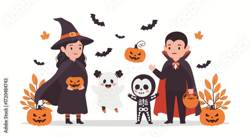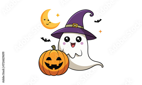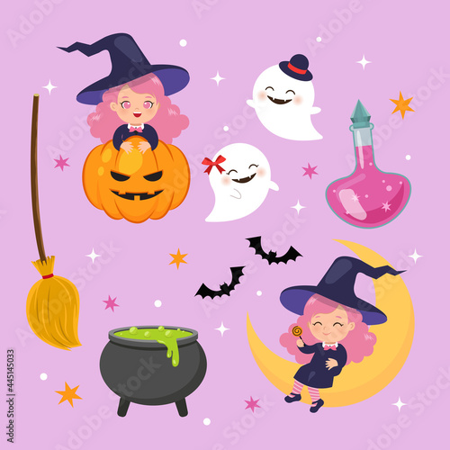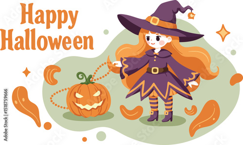 Очарованная маленькая ведьма, девочка-ребенок, мультяшный персонаж Хэллоуина, векторная иллюстрация. Маленькая волшебница, держащая резной тыквенный фонарь, традиционный осенний символ