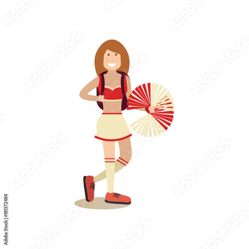 Векторная иллюстрация симпатичной девушки-болельщицы, держащей красный помпон. Элемент дизайна в плоском стиле концепции School people, значок, выделенный на белом фоне.