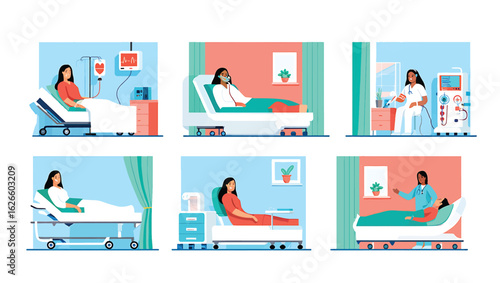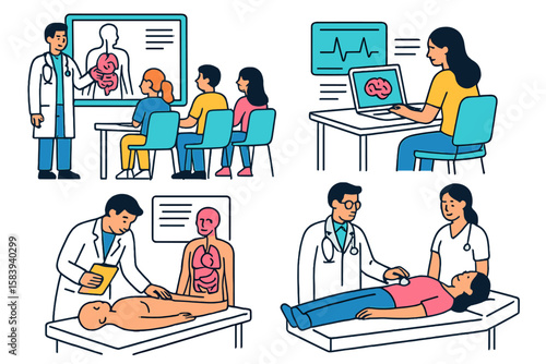 Шеф-повар готовит векторную сцену японской кухни. Набор изолированных иллюстраций для приготовления японского фаст-фуда. Повар, стоящий у стойки, готовит лапшу и суши, подает блюдо