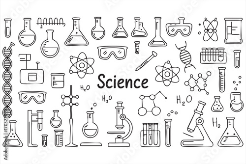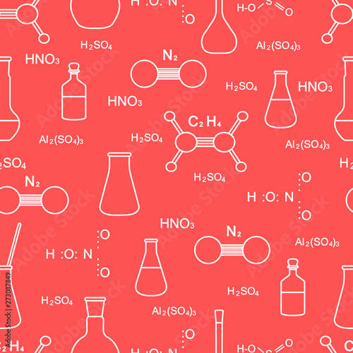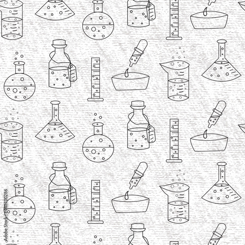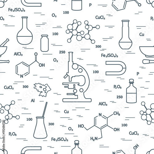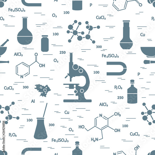 Химические формулы и колбы на белом фоне. Бесшовный узор. Векторная иллюстрация.