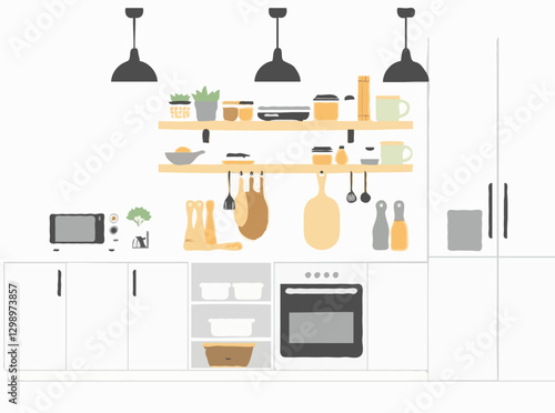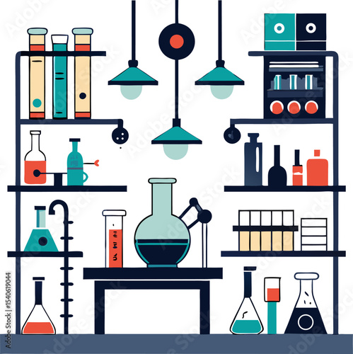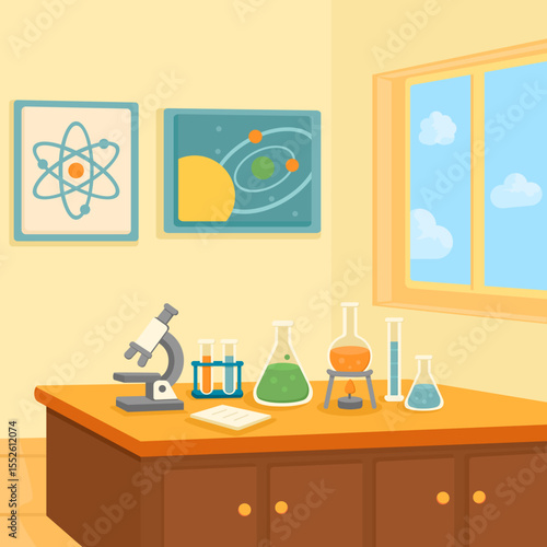 Шаблон векторного плаката научной лаборатории. Интерьер химической лаборатории с микроскопом, колбами, мензурками и горелкой на полках. Оборудование и стеклянная посуда для лабораторных экспериментов, иллюстрация в плоском стиле.