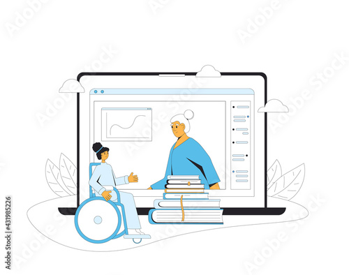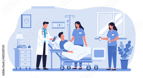 Детская больничная палата. Медсестра, стоящая рядом с капельницей, больной мальчик, лежащий в постели и получающий внутривенную терапию, плоская векторная иллюстрация. Педиатрическая больница. Здоровье детей.