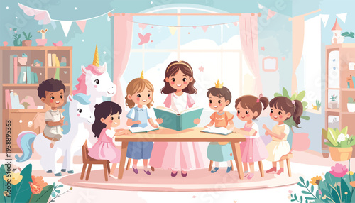 Дети выступают на театральной сцене. Векторная иллюстрация милых детей в костюмах льва и кролика, участвующих в спектакле, показывающем представление для родителей