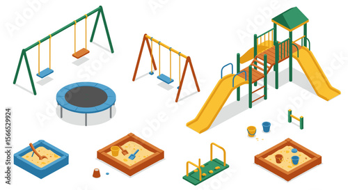 Набор значков детской игровой площадки, векторная плоская изолированная иллюстрация. Изометрические прыжки на батутах, горке, качелях, пружинной качалке, карусели, песочнице и т.д. Игровое, спортивное и парковое оборудование для улицы.