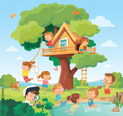 Дети играют в домике на дереве в саду на заднем дворе векторная иллюстрация. Два маленьких мальчика-брата или друга мультяшного персонажа дурачатся и веселятся во время приключений на свежем воздухе на летних каникулах
