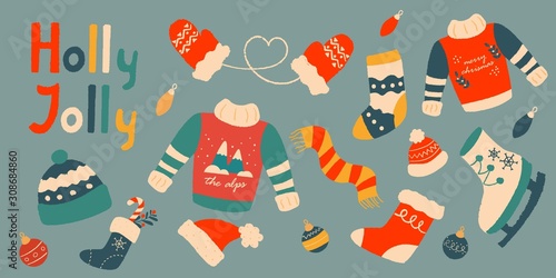 Фон с рисунком Рождества и Счастливого Нового года. Векторная иллюстрация с рождественскими игрушками и подарками. Шаблон баннера и праздничной поздравительной открытки. дизайн оформления зимнего сезона 2022 года.
