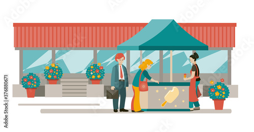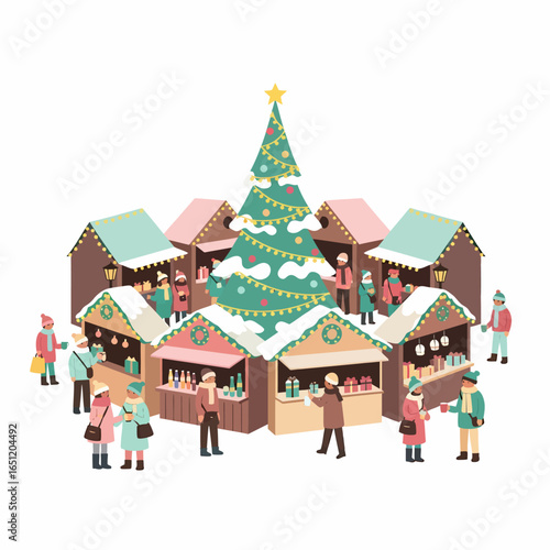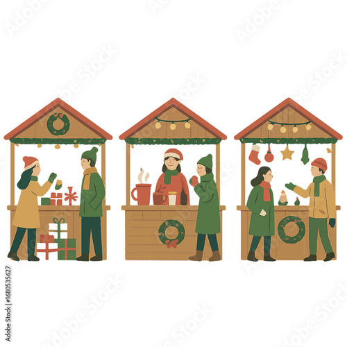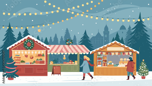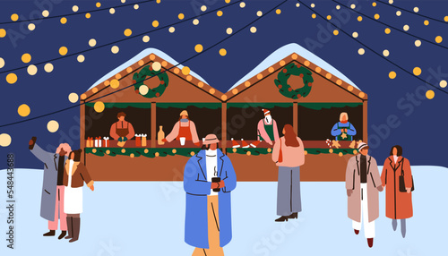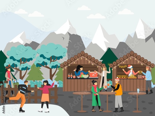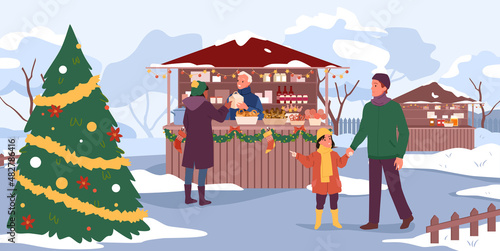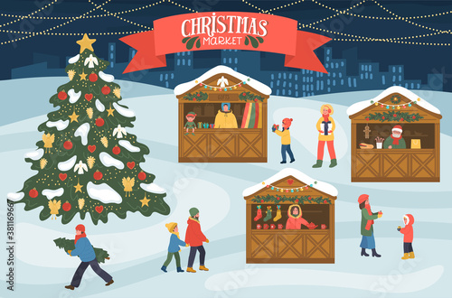 Новогодняя ярмарка установила плоскую векторную иллюстрацию. Зимние уличные рыночные прилавки и продавцы. Счастливые люди пьют глинтвейн, покупают рождественские подарки, печенье, катаются на коньках возле украшенной городской елки