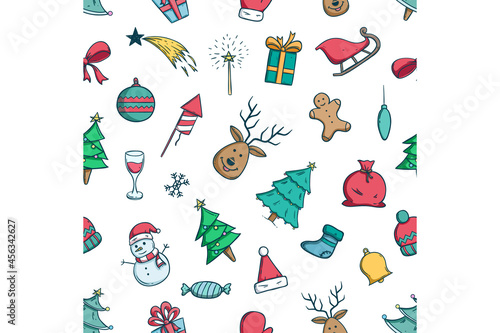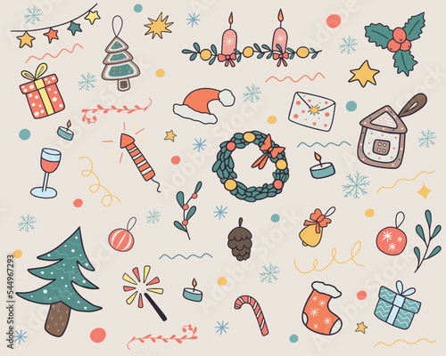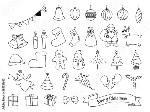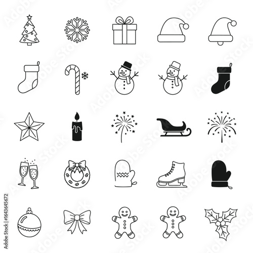 Набор иконок Рождества и Нового года. Векторные декоративные праздничные символы Санта Клаус, северный олень, подарочная коробка, снеговик, колокольчики, шампанское. Иллюстрация дизайна в плоском стиле тонкой линии, изолированная на белом фоне.