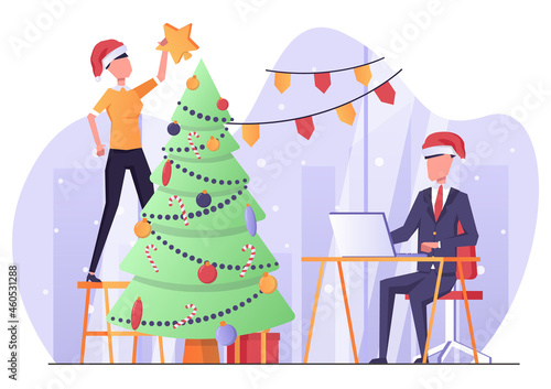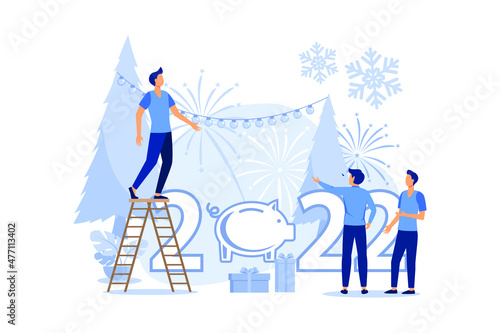 Люди делают снеговика, векторная иллюстрация. Подготовка к празднованию Рождества и Нового года композиция для плаката, баннера, страницы сайта и т.д.