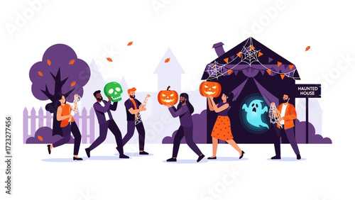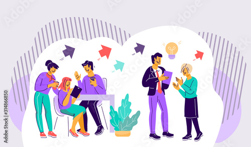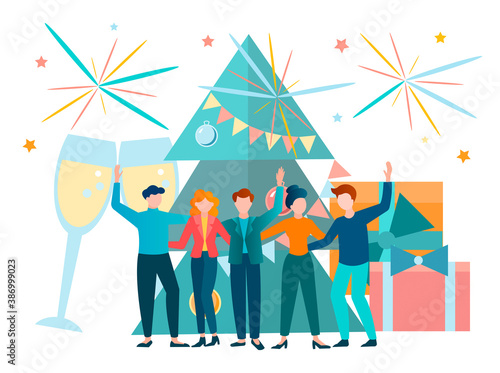 Люди поют рождественские гимны с леденцами и свечами, векторная иллюстрация. Композиция для празднования Счастливого Рождества для плаката, баннера, страницы сайта и т.д.