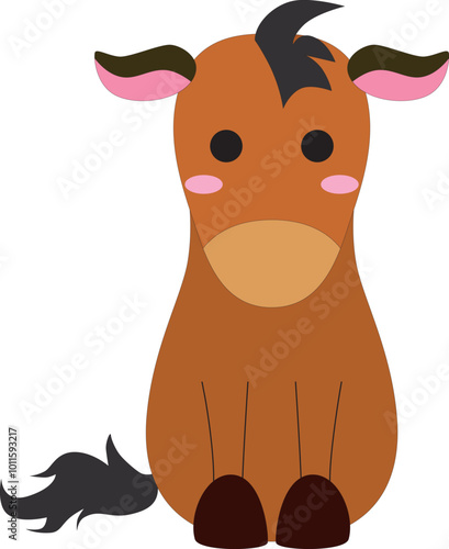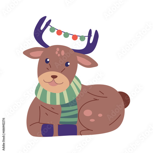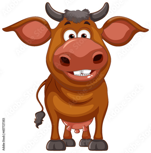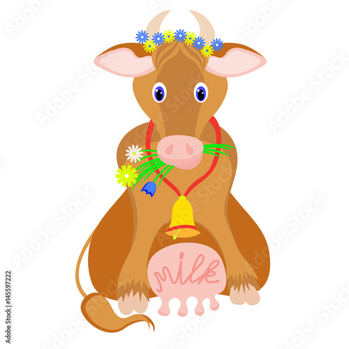 Персонаж рождественской коровы, держащий колокольчик, и значок новогоднего фейерверка, выделенный на белом фоне.