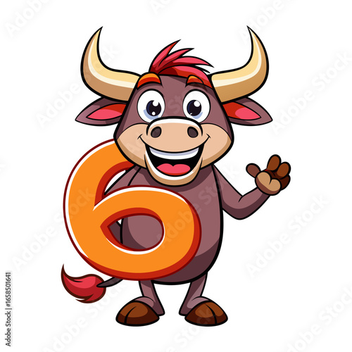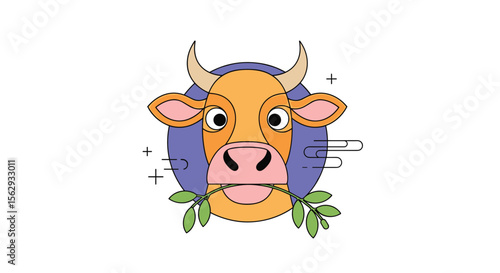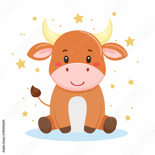 рождественский персонаж-корова, держащий векторный значок со звездами, изолированный на белом фоне.