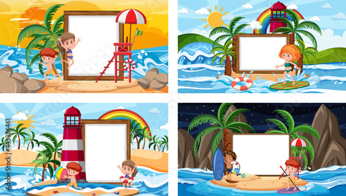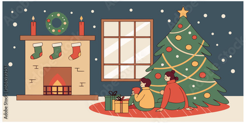 Изолированный набор рождественских дизайнерских открыток. Праздничный интерьер гостиной с сервированным столом, упакованными подарочными коробками, уютным камином и украшенной векторной иллюстрацией ели