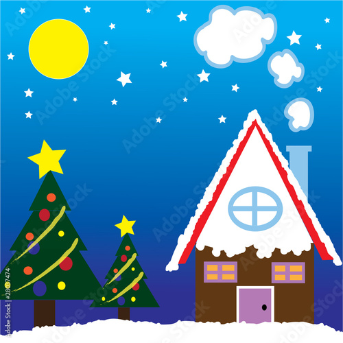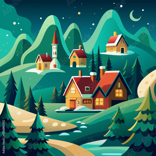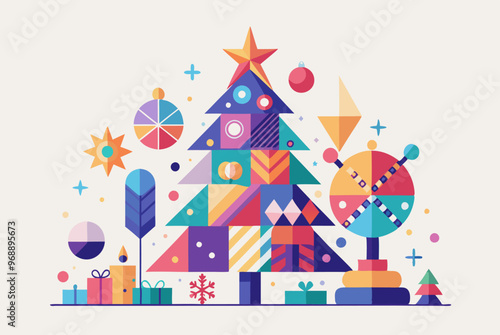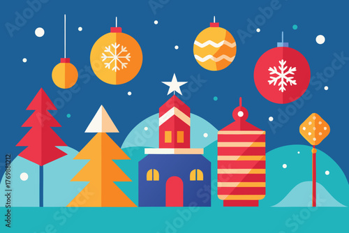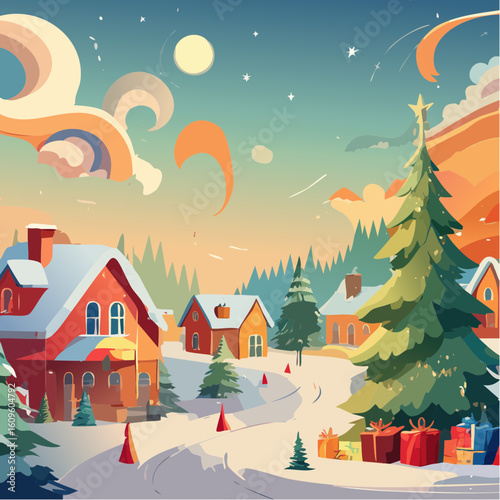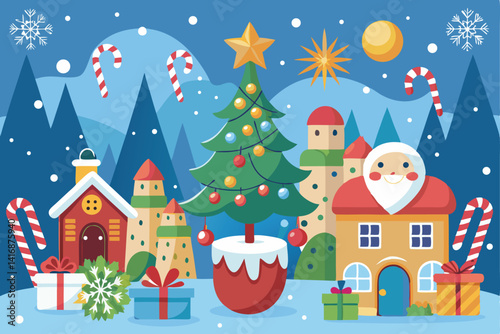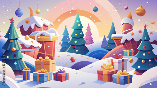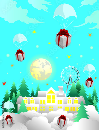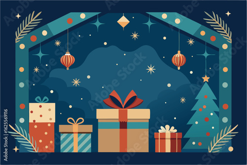 Рождественские подарки, векторная иллюстрация в стиле бумажного искусства. Откройте волшебную коробку со взрывом рождественских украшений, пейзажем зимнего ночного леса со снежными деревьями и подарочными коробками.