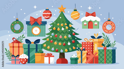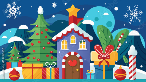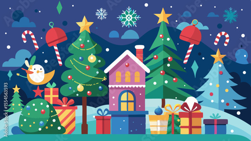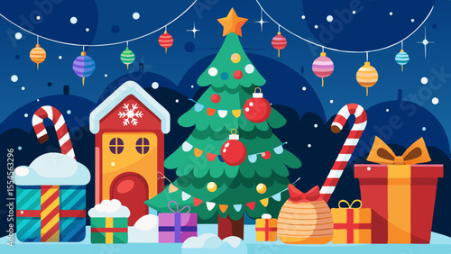 Рождественские подарки, векторная иллюстрация в стиле бумажного искусства. Откройте волшебную коробку со взрывом рождественских украшений, пейзажем зимнего ночного леса с заснеженными деревьями и подарочными коробками.