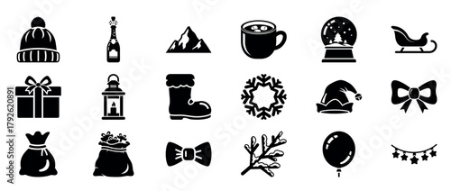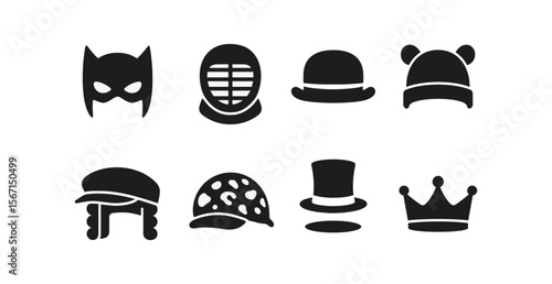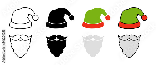 Рождественские шляпы и украшения, плоская векторная изолированная иллюстрация. Шляпы Санта-Клауса, забавные эльфийские ушки, оленьи рога, карнавальные повязки на голову. Набор рождественских костюмов.