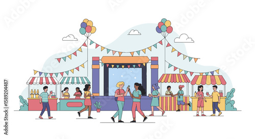Векторная иллюстрация концепции рождественского настроения в плоском стиле. Время Рождества. Заснеженная улица, городская жизнь. Люди идут по улице, делают покупки, мать катает на санках свою дочь, элементы дизайна.