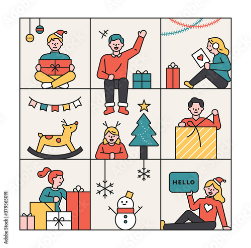 Вектор рождественских соседей. Счастливые люди-соседи в окне жилого дома поздравляют и здороваются друг с другом. Карантин в праздничные дни, социальное дистанцирование, концепция пребывания дома