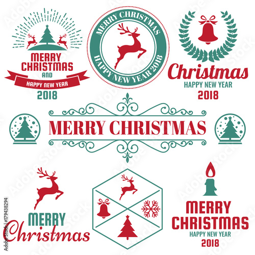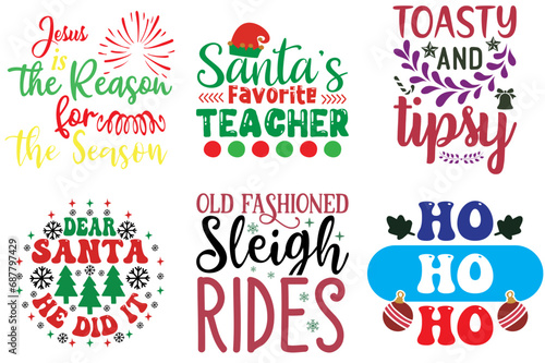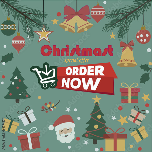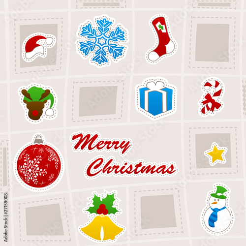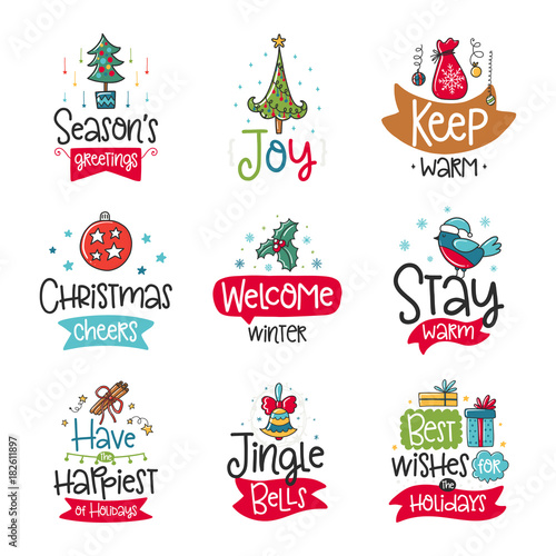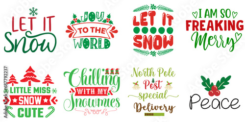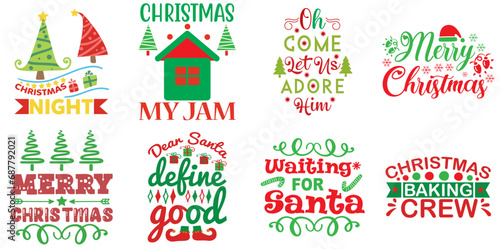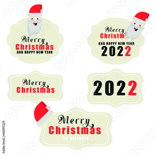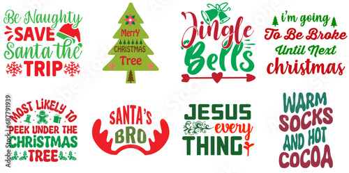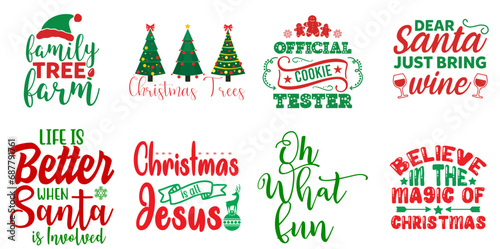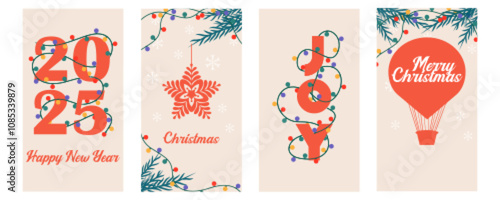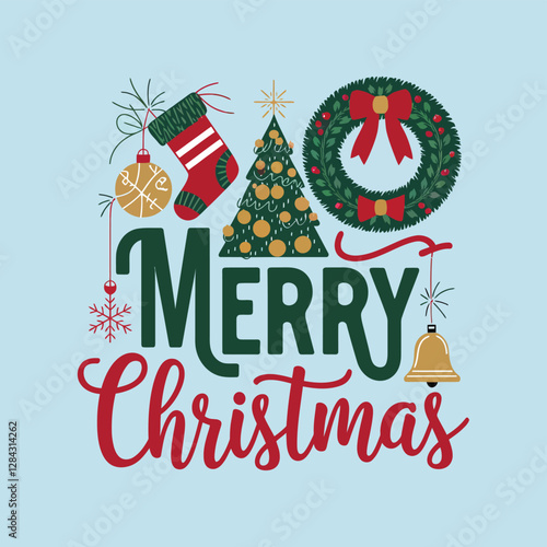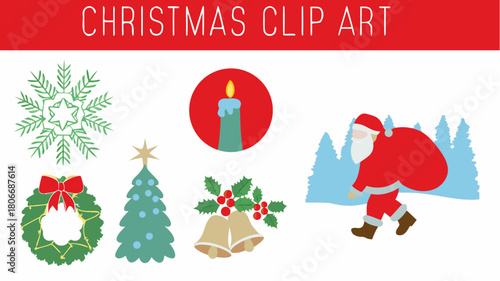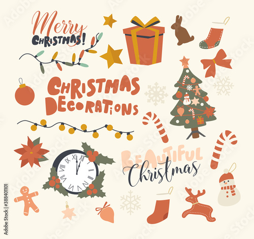 Реквизит рождественской фотобудки, набор украшений для вечеринки, плоская векторная изолированная иллюстрация. Шляпа Санты, борода, очки, подарочная коробка, рождественский чулок, елка, венок, ягоды остролиста, варежка, повязка на голову из леденцовой трости.