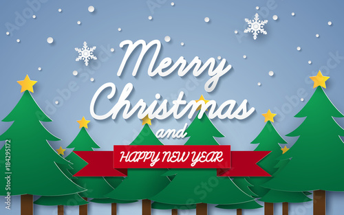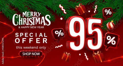 Шаблон плаката рождественской распродажи, векторная иллюстрация в современном стиле бумажного искусства. рекламный баннер сайта с 50-процентной скидкой красного цвета с ветками рождественской елки, ангелами, подарочными коробками.