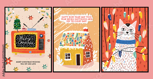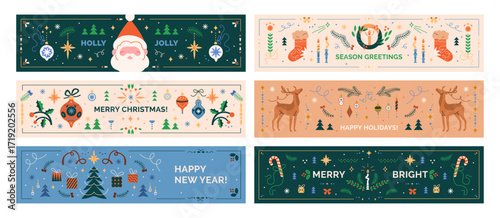 Рождественский бесшовный узор векторного набора в винтажном скандинавском стиле.Новогодний зимний праздничный фон с рождественской елкой, Санта-Клаусом и подарками.