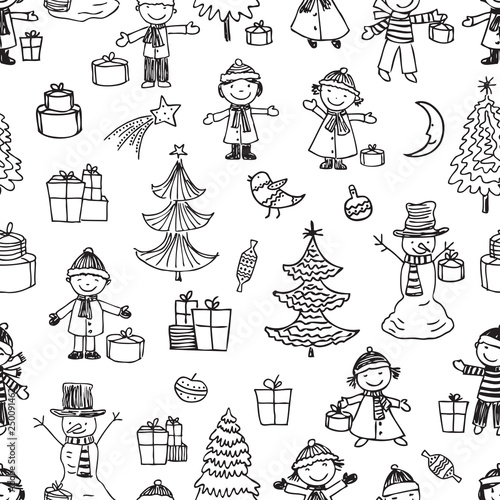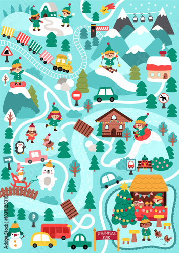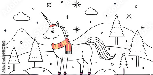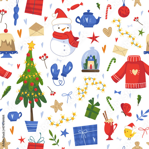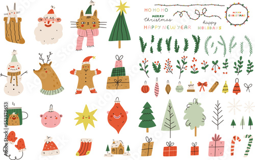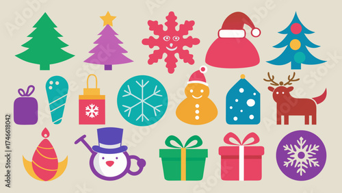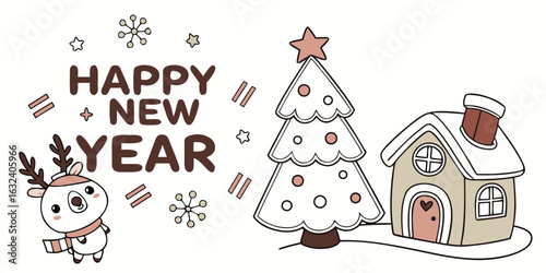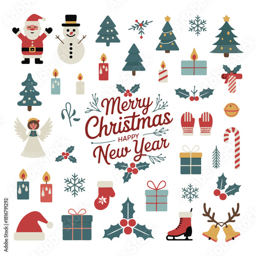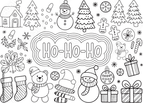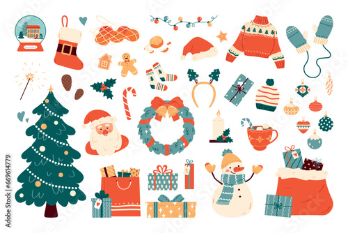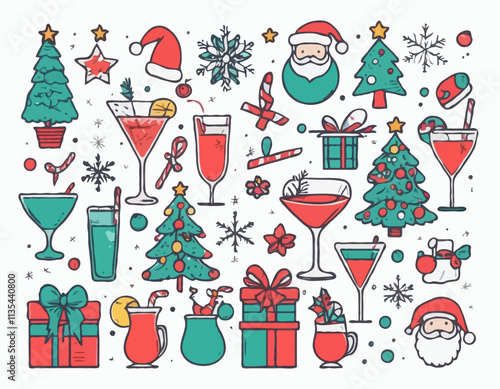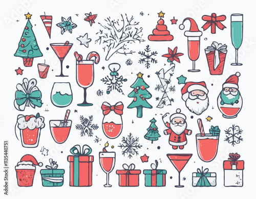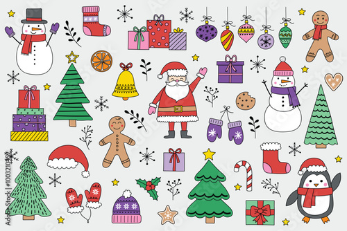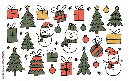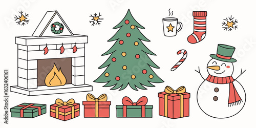 Рождественская елка с набором иконок Рождества и Нового года. Векторные декоративные праздничные символы олень, подарок, снеговик, колокольчики, шампанское. Иллюстрация дизайна в плоском стиле тонкой линии, изолированная на белом фоне.